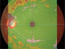A 12 x 9 mm wide area image centered on the macula can be captured with the Retina Scan Duo™. The 9 x 9 mm normative database provides a color-coded map indicating distribution range of the patient's macular thickness in a population of normal eyes.