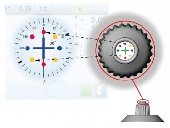 This function shows the lens distortion of glasses used by customers. It compares the vertex power of peripheral eight portions with the power of center portion in the nosepiece aperture. The degrees of deviation from ISO standards at the peripheral eight portions are displayed by colors.