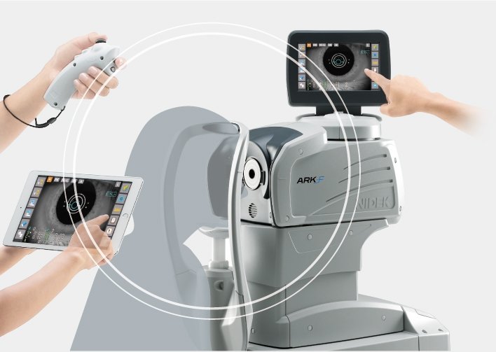 Manual measurement using the large, durable 7.0-inch touch screen is also possible with the ARK-F/AR-F. Alignment is easily achieved by simply long-pressing a position on the screen and an icon. Clearly identifiable icons assure intuitive operation. Moreover, a newly designed hand-held control and tablet control software are available as options that increase operator freedom and productivity.