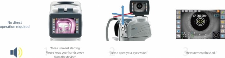 Simply by placing the chin on the chinrest, NIDEK eye detection camera automatically detects the position of the eyes and measurement starts without pressing any button. Gentle voice guidance facilitates smooth measurement for any operator.
